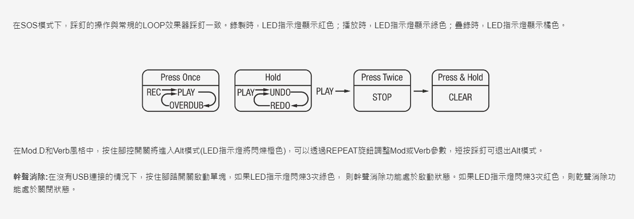 SOS全名為Sound On Sound,是一款長達40 秒的立體聲句循環播放器,供吉他手練習創作。當循環樂句在播放時,您可以退出SOS並切換成另一種延遲效果,並使用效果進行演奏,而且不會中斷播放,注意:當您退出SOS到另一種延遲模式時,它將啟用新的延遲效果。