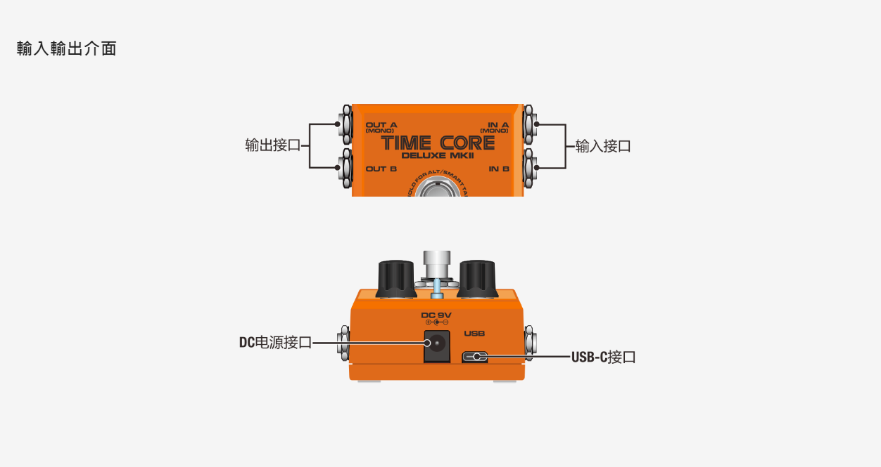 左側為標準的單聲道OUT接口,可以使用一條樂器連接線,連接到信號鏈中的下一個設備,如果有兩個輸入,則使用一對6.35mm線。