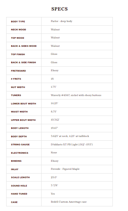 HANDMADE - BEDELL FIRESIDE PARLOR WALNUT – WALNUT 12fret GUITAR