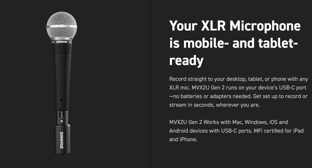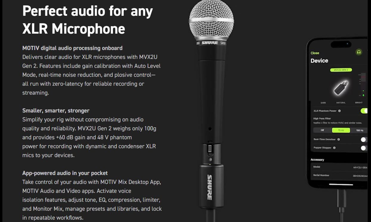 MVX2U Gen 2 is a next-generation, single-channel XLR-to-USB interface that lets you capture studio-quality audio wherever you go. Designed for streamers, podcasters, and creators on the move, it offers full mobile and tablet compatibility for those working across multiple devices. With Shure's digital audio processing technology built into each MVX2U Gen 2, creators can record or go live from a desktop, phone, or tablet using the same simple, uncluttered cable setup, while delivering clean, consistent audio with the same sound signature, on any connected XLR microphone.