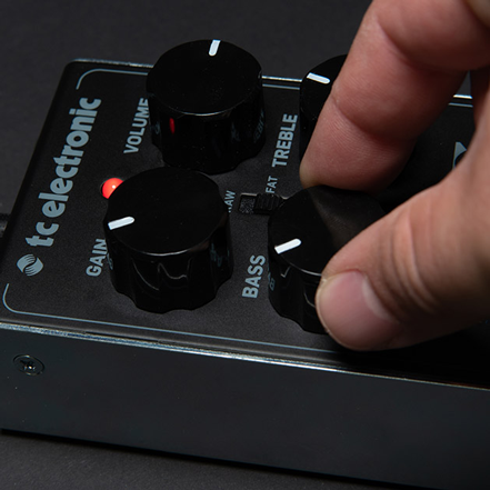 When it comes to mastering metal guitar tones, the mid frequencies are where it all happens. That’s why FANGS METAL DISTORTION features a versatile mid-frequency selector switch in addition to the typical Bass and Treble controls. This handy little control lets you go from raw classic metal tones to scooped nu-metal – and all the way to super-beefy sludge metal tones, with just the flick of a switch.