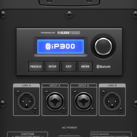 The iP300 features a fully addressable onboard digital mixer with two combo jack/XLR connectors that accept balanced and unbalanced connections for dynamic mics and line-level instruments. The simple and intuitive user interface consists of a single rotary push-encoder with Process, Setup, Exit and Enter function buttons. A beautifully-backlit display controls DSP functions including mixer parameters, 3 band EQ, and presets. All settings can be controlled locally, or via free downloadable iPhone/iPad apps – and locked down to prevent unauthorized access.