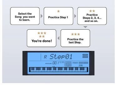 使用教學功能,輕鬆盡享演奏內建歌曲。這些便利的教學功能將有助您練習內建的歌曲並增強您的演奏技能。安排這些教學功能,乃旨在獲得最佳且愉悅的學習效果,因此,只需選取適合您的歌曲,然後讓您的琴鍵演奏上升至下一級。