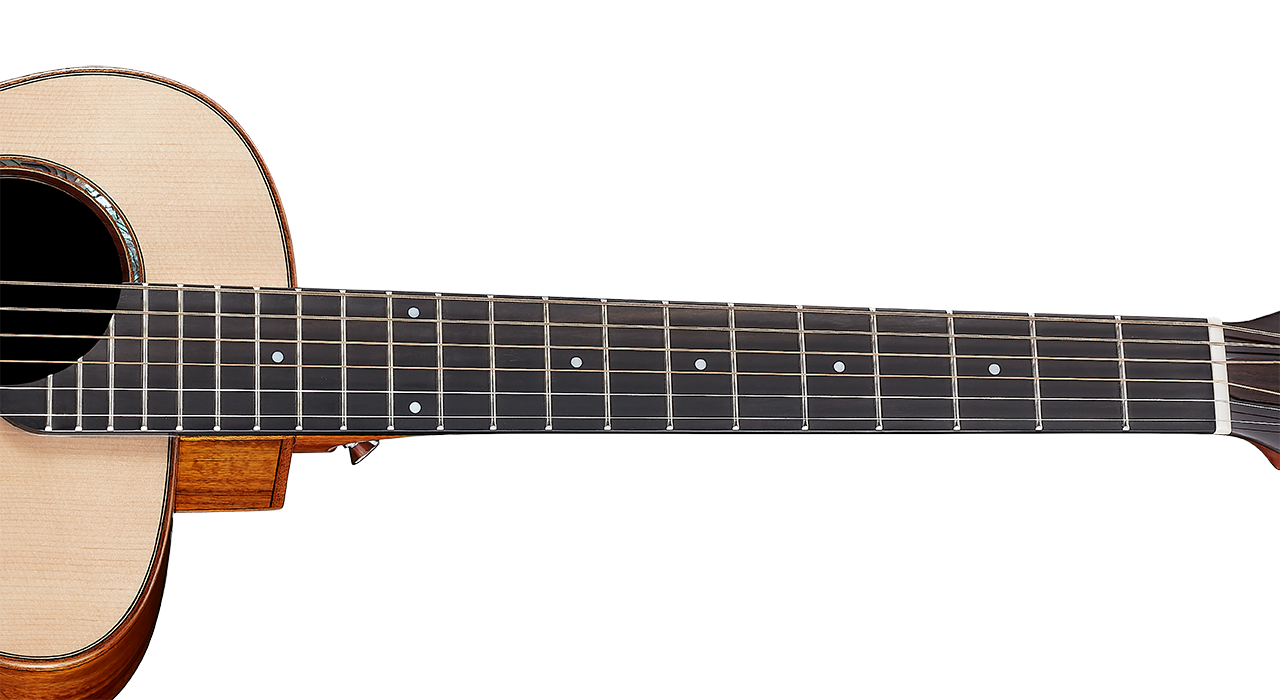 指板使用烏黑色澤的黑檀木,擁有緊密的木紋,硬度更勝玫瑰木。黑檀木的傳導特性,將吉他的高頻更加地顯現出來。琴頸與指板經過拋光、打磨、倒角、去毛刺等多種細節程序處理,講究指板弧度打磨設計,能符合手指弧度,讓持琴手感更加舒適。上弦枕寬度為44mm,,並在3, 5, 7, 9, 12, 15格鑲嵌白貝殼圓點造型設計。擁有21格琴格讓彈奏音域更廣。