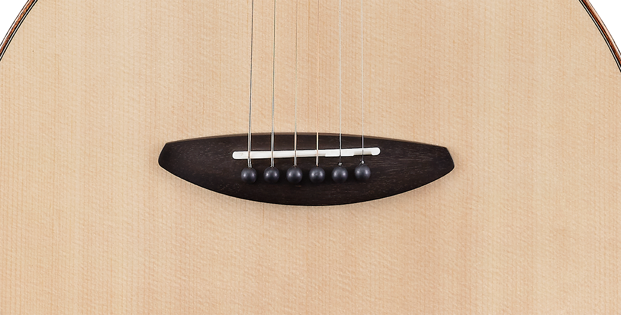 鳥吉他定製的造型琴橋,使用烏黑色澤的黑檀木,擁有緊密的木紋硬度,硬度更勝玫瑰木,能支撐琴的後段琴弦張力。搭配水牛骨弦枕,讓琴的延音有力,且擁有純淨的音色,質地堅硬清脆,能有效的傳導琴弦的共鳴。每一根弦都做了個別補償,讓琴能有更精準的音準。