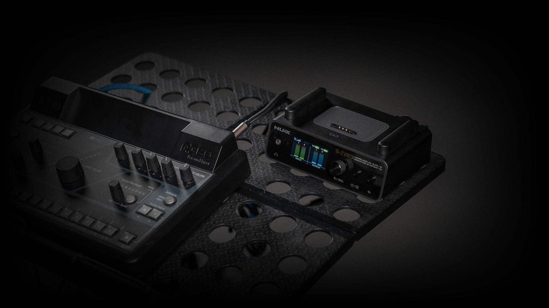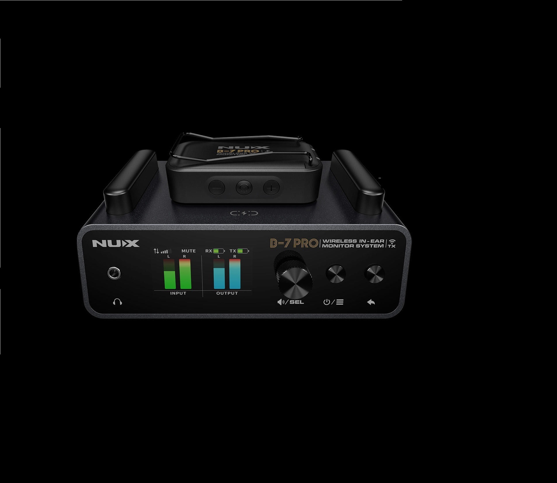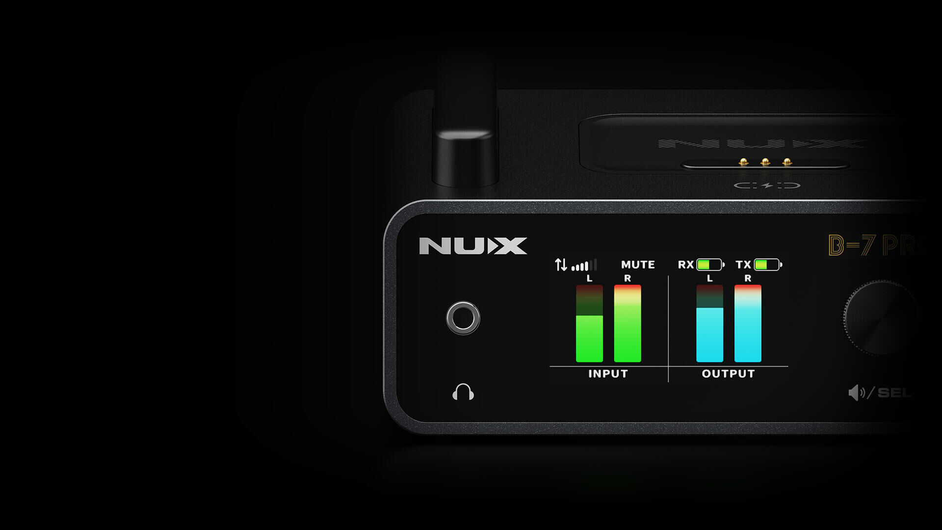 The NUX B-7 PRO is a personal wireless in-ear monitor system with automatic setup, 2.4 GHz interference-free broadcasting frequency, and 24-bit 48 kHz high-quality stereo audio. The signal transmitting latency is as low as 7.3ms at peak performance. The operation range is up to 50 meters (160-feet).