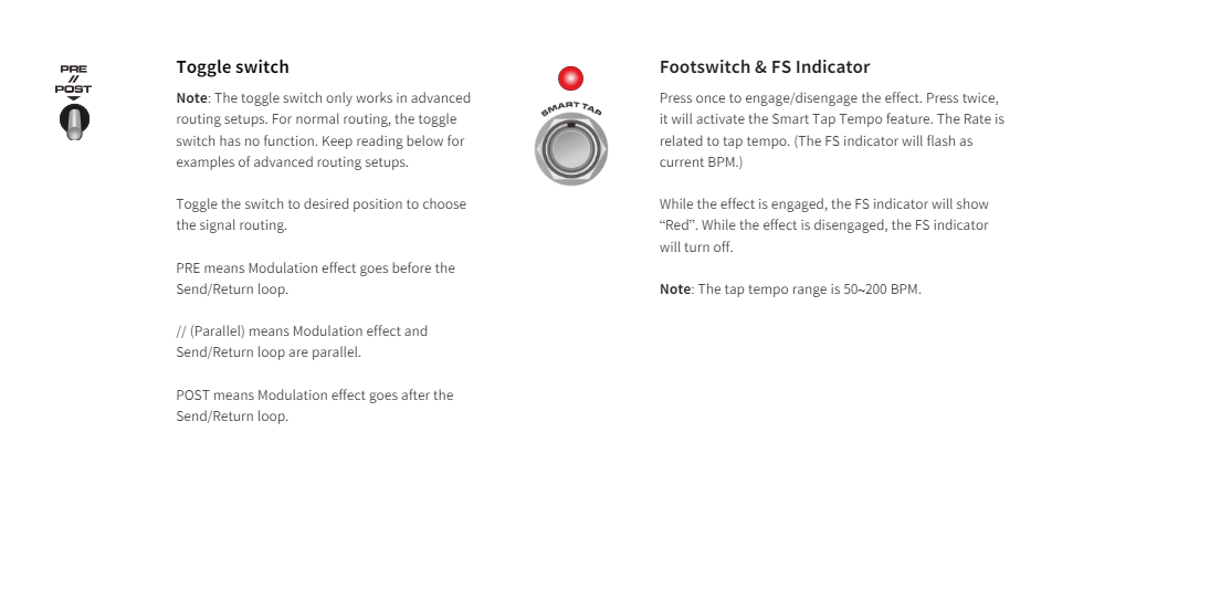 MOD CORE DELUXE MKII的SEND/RETURNS效果迴路可以提供您多樣化的效果器組合訊號鏈(高級連接模式)。使用MOD COREDELUXE MKII您可以輕鬆獲得兩路單聲道訊號來組成自訂效果迴路。此外,您還可以將兩路訊號並聯,然後在ALT模式下使用TWEAK旋鈕來將其混合。透過三檔拔檔開關,選擇一種模式即可開始探索專屬於您的音色。