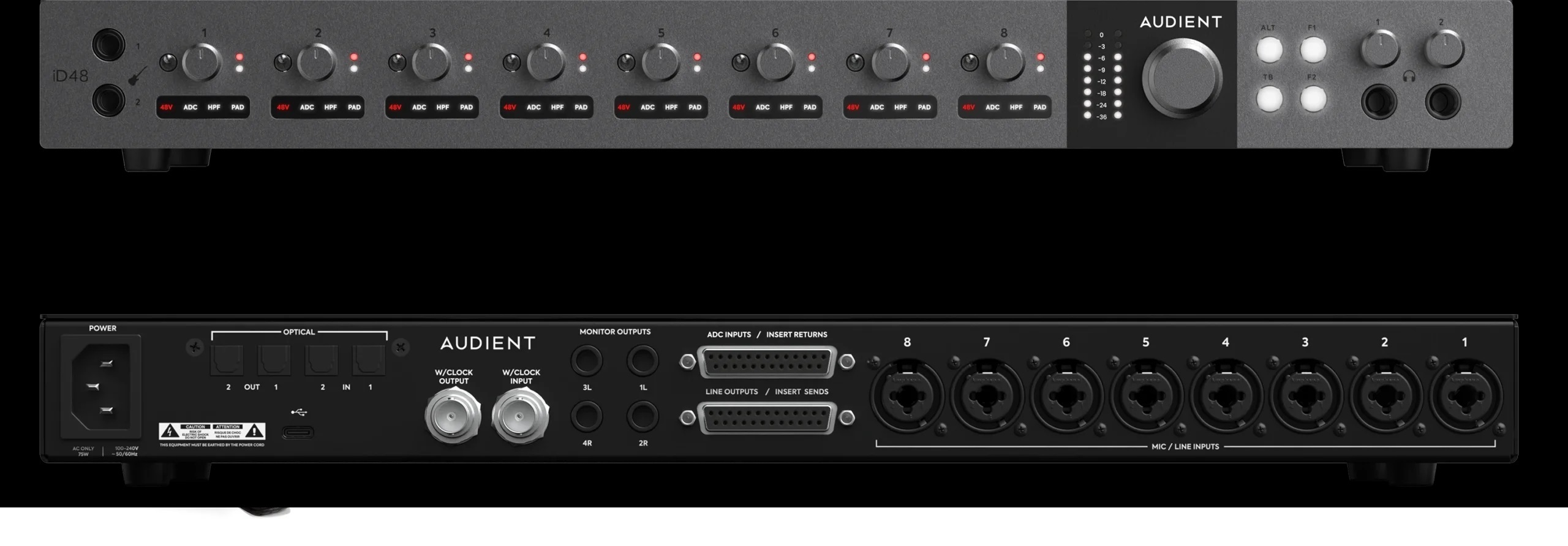 Bigger, better and more powerful than ever, iD48 is the flagship USB iD interface made for producers and engineers. Packing in eight Audient Console Mic Preamps, advanced 32-bit ESS converter technology and the all new Switchable Analogue Insert technology, iD48 seamlessly combines astonishing audio performance with ease of use. Add to that professional must have features like ADAT expandability and customisable monitor control, iD48 is ready to transform your studio.