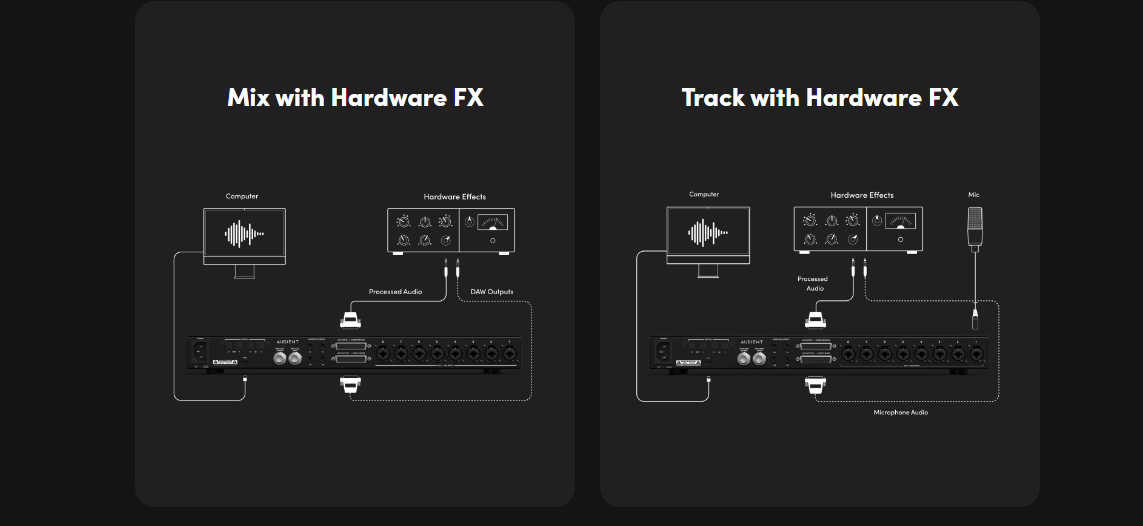 And for the first time ever, iD48’s Switchable insert routing enables you to select which source is feeding the ADC path. Letting you choose whether to send the Audient Mic Preamp or a DAW output to your outboard on a per channel basis and all without having to plug or unplug cables.