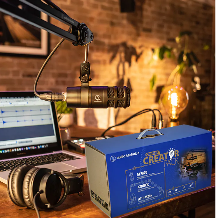 AT2040CP 這款經濟實惠的錄音套裝是專為串流媒體主播、家居錄音愛好者和自媒體創作者量身打造。套裝包含了AT2040 超心形動圈麥克風、ATH-M20x 專業監聽耳機,以及AT8700C 可調式懸臂麥克風支架。旨在提供專業的錄音品質和監聽效果,讓創作者能夠輕鬆製作出高質量的音頻內容。
