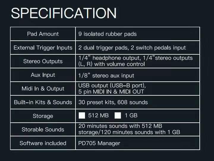 5 針 Midi In \ Out 連接埠 USB MIDI 連接埠,可連接電腦,易於錄製。 1/4 吋立體聲輸出(l,r),1/4 吋 HEADPHOHE 輸出和 1/8 吋立體聲 AUX 輸入。 2 個額外的鼓墊輸入,支援連接雙區觸發墊,2 個腳踏開關輸入(踏板或踩踏踏板)。