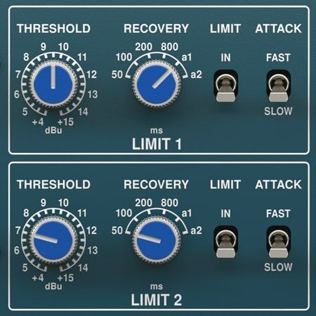 The 369’s Limiter takes a more aggressive approach to controlling peaks and dynamics than the compressor part of the unit. Threshold determines at what specific level the Limiter engages while Recovery controls how fast the Limiter bounces back to normal. With a recovery range from 50 to 800 milliseconds this allows you to work with the Threshold level, a fast or slow Attack time along with Recovery time to make your final mix pump the dance floor or tame those peaks in a more subtle manner - or find that tasty sweetspot somewhere in between.