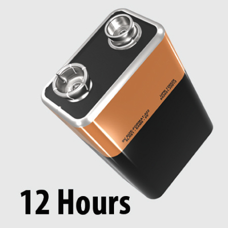 Runs up to 12 hours on a 9 V battery (not included)