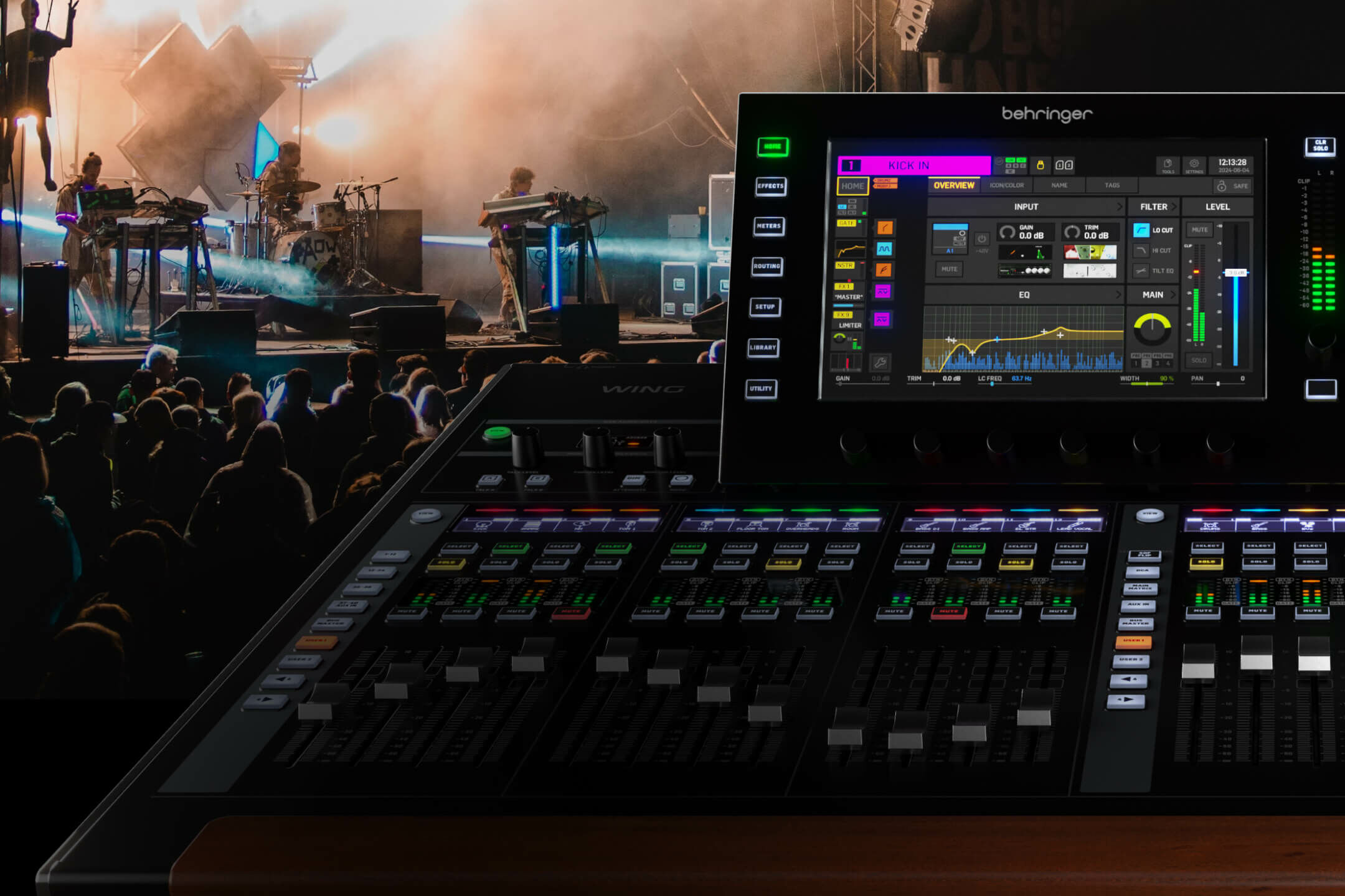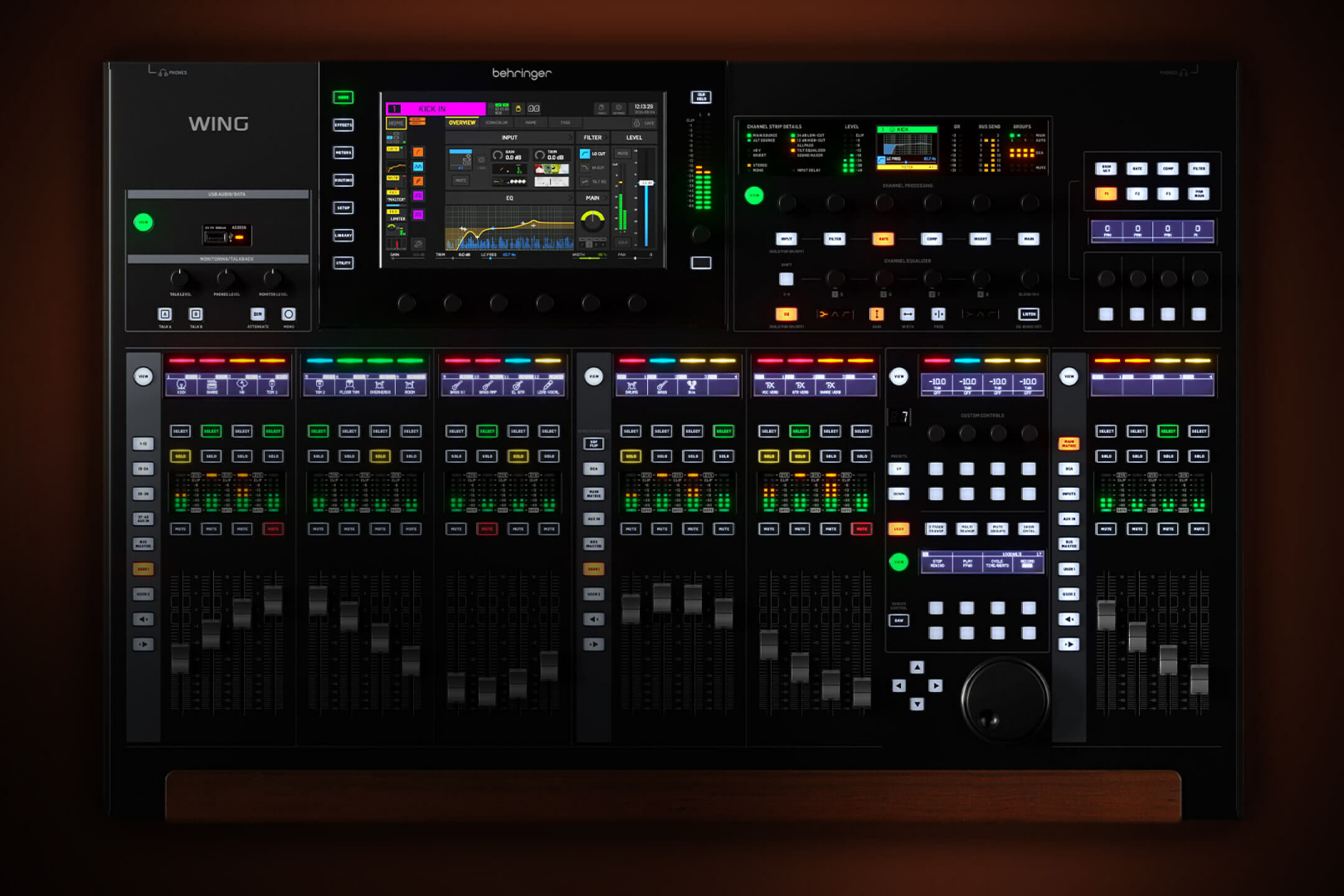 WING boasts a spacious mixer surface, a unique channel editing section, dedicated master and bus areas, and a large touch screen with rotary controls for intuitive parameter adjustments.