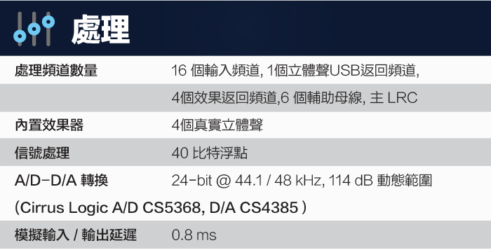 包括Delay、Chorus、Dynamics...等等,與主和輔助輸出上的31段EQ同時工作,這些都不需要額外的硬件。