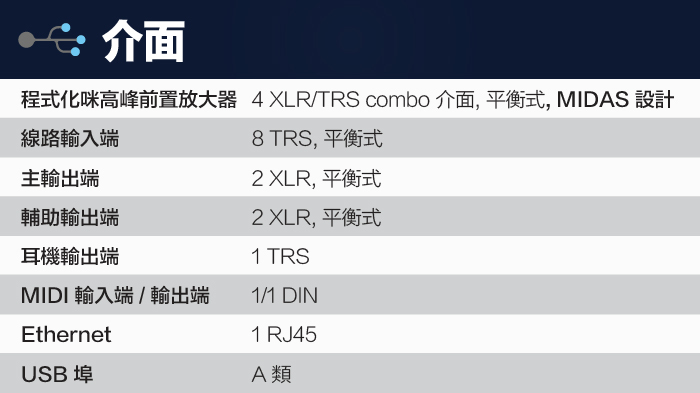 憑藉4個獲獎MIDAS設計的麥克風前級放大器,和方便的無線控制Wifi模組,它非常適合在表演現場和錄音室來應用。