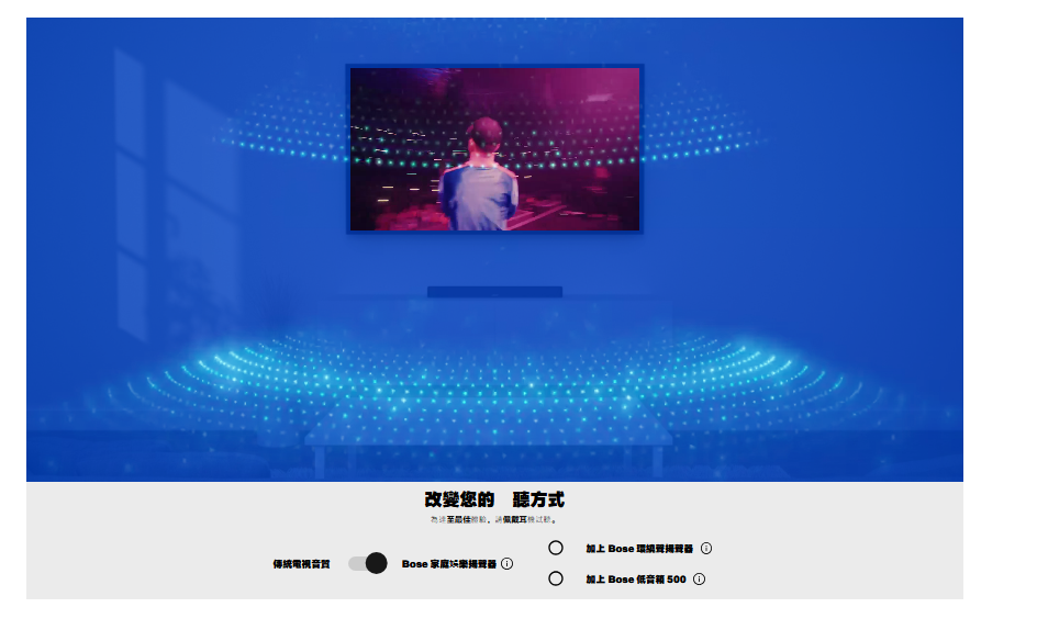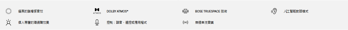 Dolby Atmos 改變了遊戲規則,將影院級的身臨其境體驗帶入你的客廳。但隨著數據庫的發展,大多數內容並非採用 Atmos 編碼。為了讓你時刻進入完全忘我境界,我們研發了 Bose TrueSpace 專利技術。此技術可智能分析你正在觀看的內容,並上混 Atmos 以外的訊號,以創造多聲道體驗。因此,即使收聽 5.1 和立體聲內容,你亦可獲得更上一層樓的身歷其境感受,感受逼真的音效水平。¹
