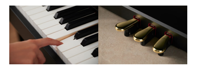 根據三角鋼琴的設計來優化踏板形狀和間距,具備連續可變制音和柔音踏板,控制穩定細膩。