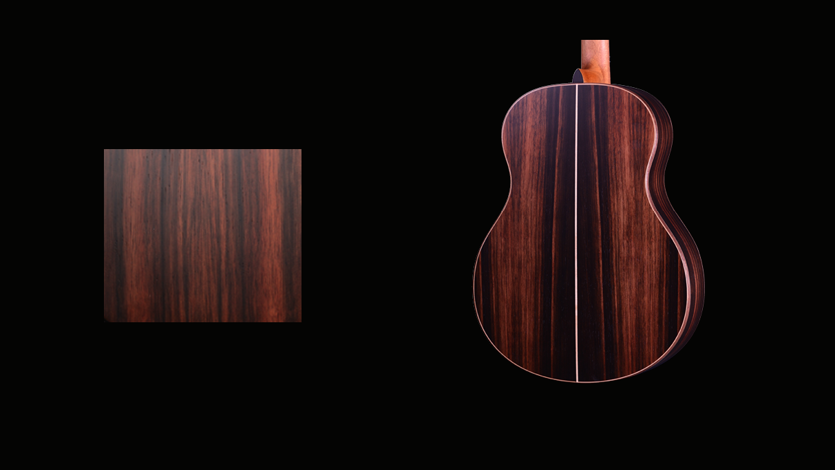Macassar Ebony 是高密度的硬木,甚至可以用於結他的指板和琴橋。 它具有令人眼前一亮的外觀,其特殊的硬度為結他提供了平衡聲音。