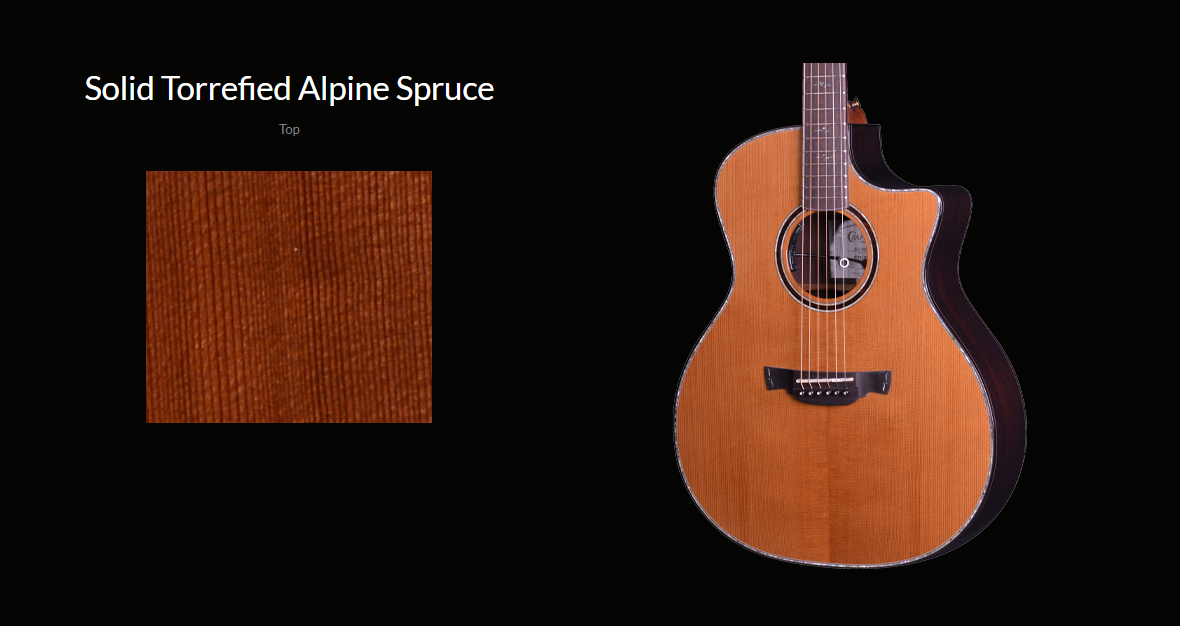 碳化(高山雲杉)結他是使用經過高溫烘烤的雲杉木材的吉他,以減少木材中的油、蒸汽和天然化合物的含量,令其共振大大提升,而表面的色澤也會變得更具復古的味道.