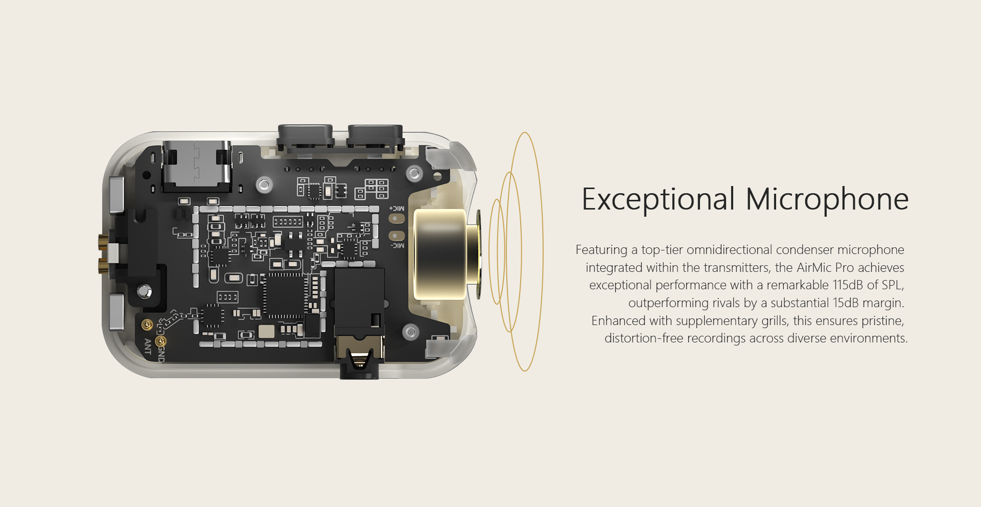 Thoughtfully designed with musicians, live streamers, vloggers, podcasters and other content creators in mind every step of the way, AirMic Pro features an intuitive full color, OLED touchscreen display on the receiver unit for immediate control of mic gain levels, monitoring output levels, and adjusting noise cancellation settings. Plus, with a high-quality omnidirectional condenser microphone built into the transmitters, expect outstanding results with 115dB of SPL, surpassing competitors by 15dB.