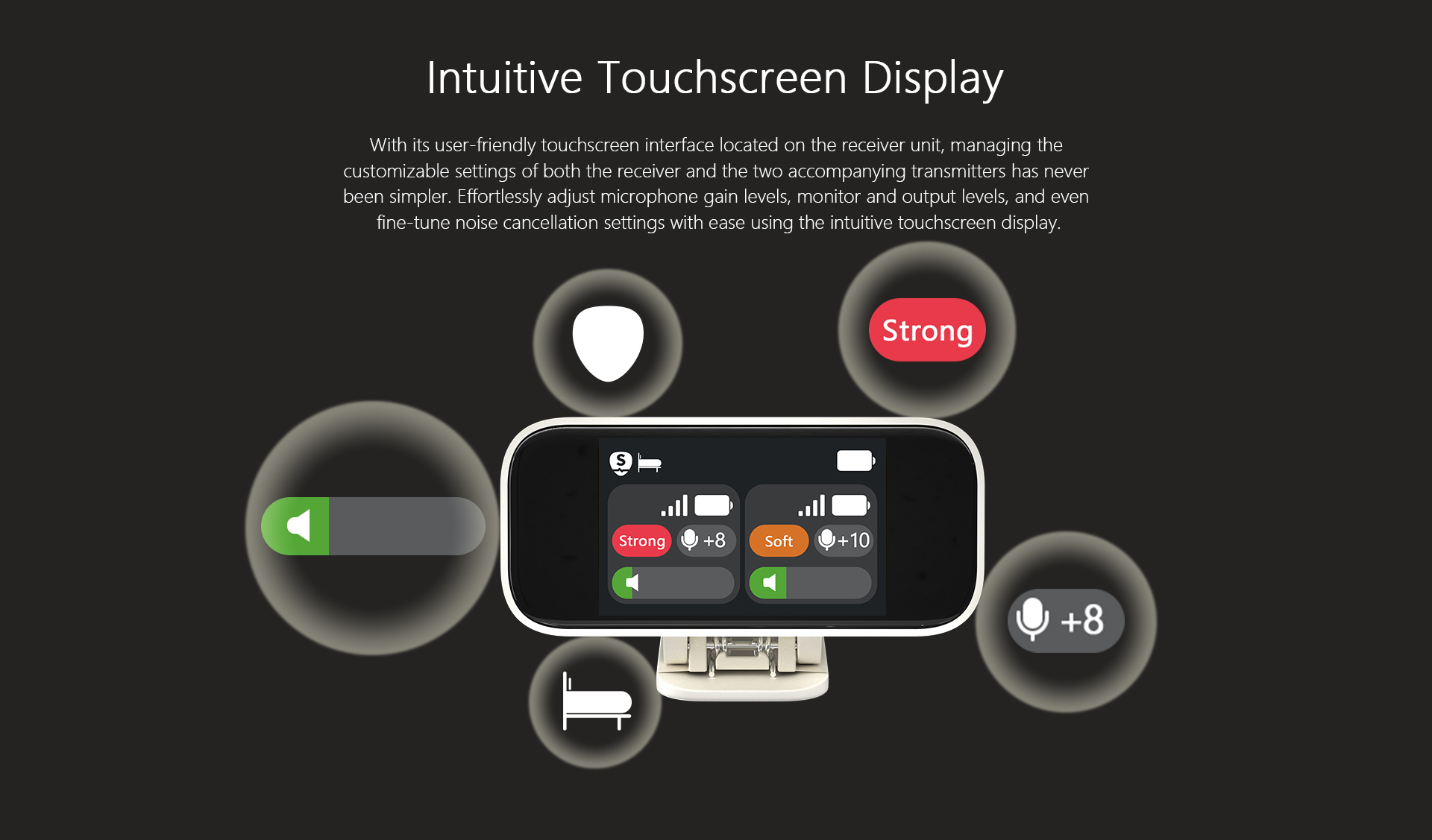 智慧型觸控螢幕系統,快速上手使用。接收器能即時監控麥克風目前使用數據狀況,在接收器端能快速調整。