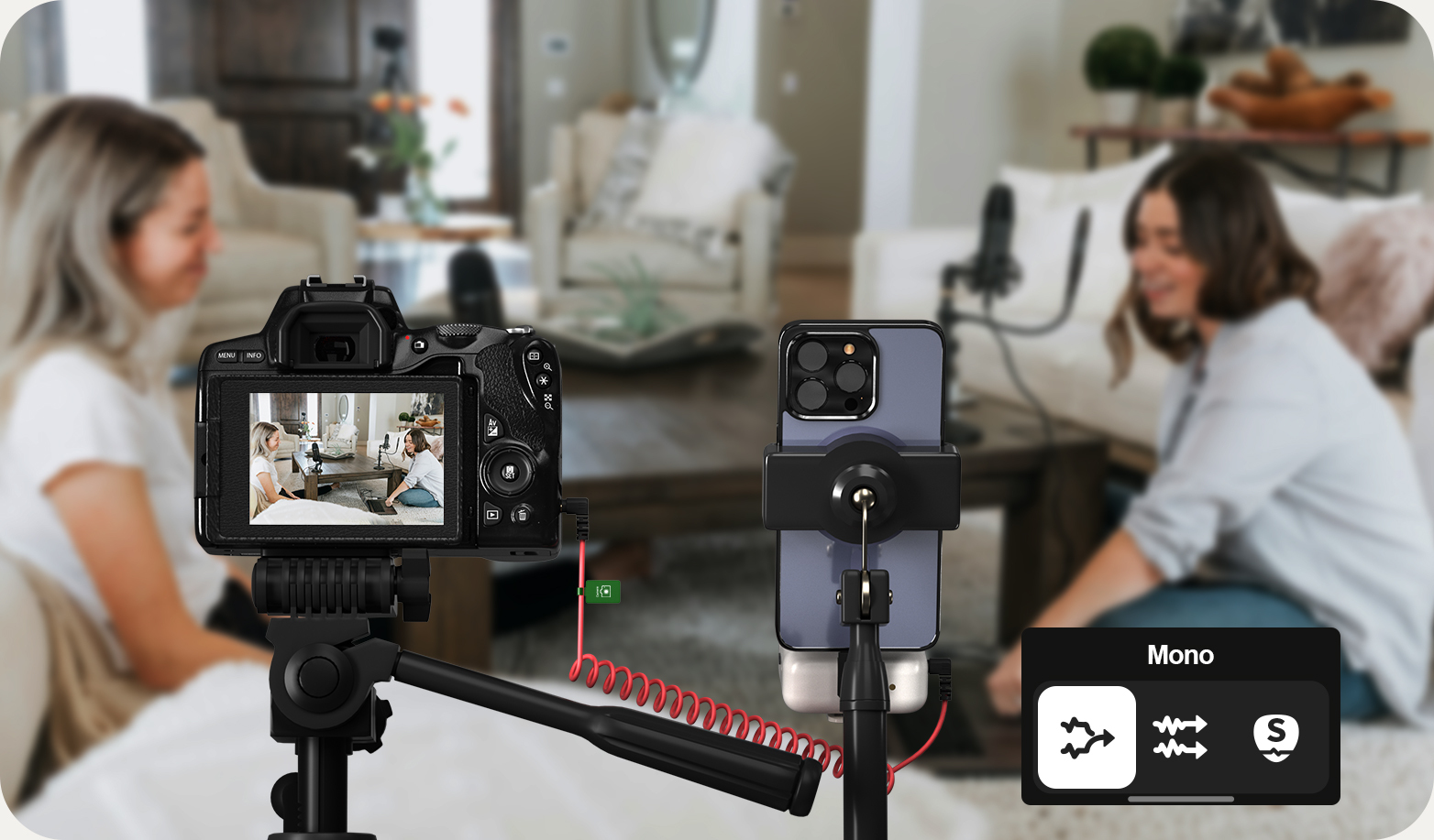 Compatible with Android, iPhones, and cameras, AirMic Pro comes with adapters and cables for versatile use. And unique to AirMic Pro, the receiver can stay connected to your mobile phone in playback mode, eliminating the hassle of disconnecting and reconnecting.