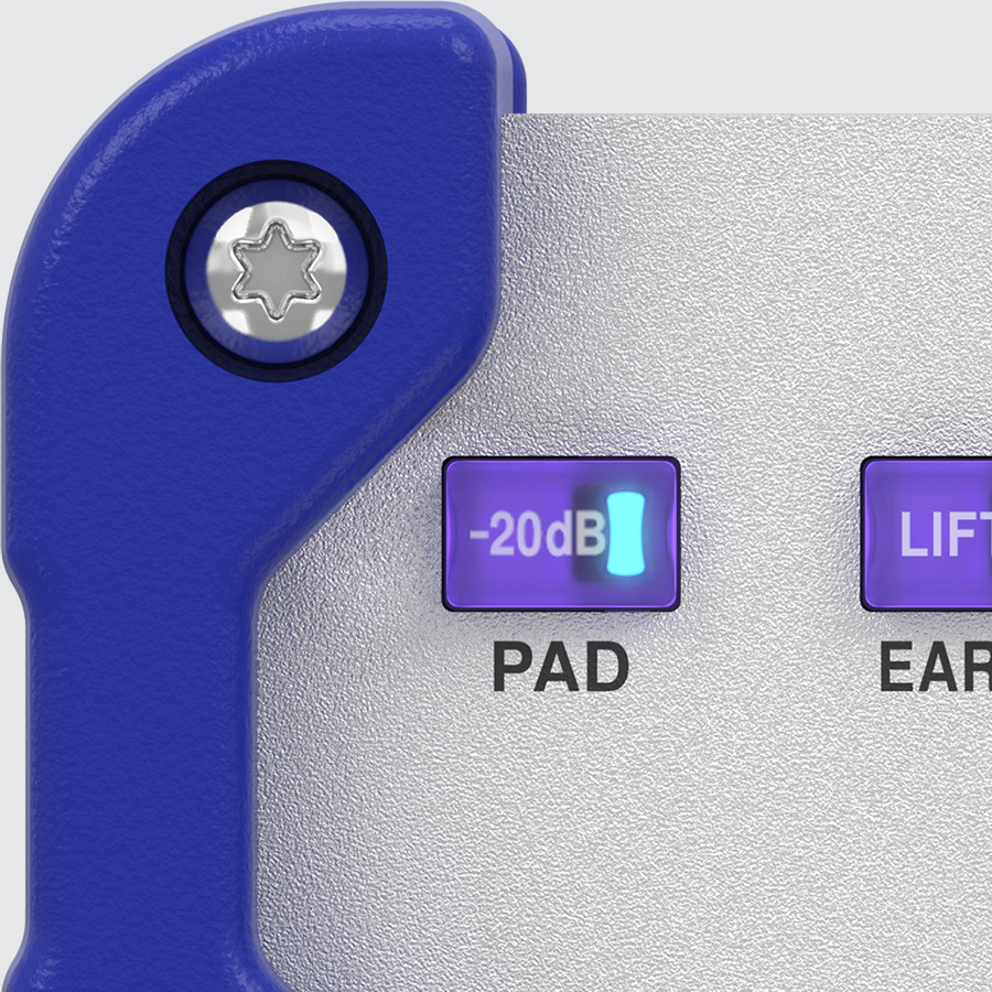 DN200 features illuminated -20 dB Pad and Earth Lift switches. The Earth Lift switch separates the input and output grounds, useful in eliminating earth loops between equipment on different mains electricity supplies.