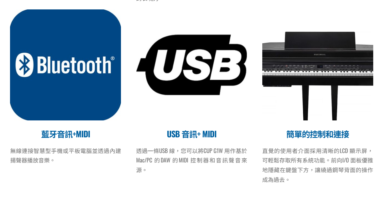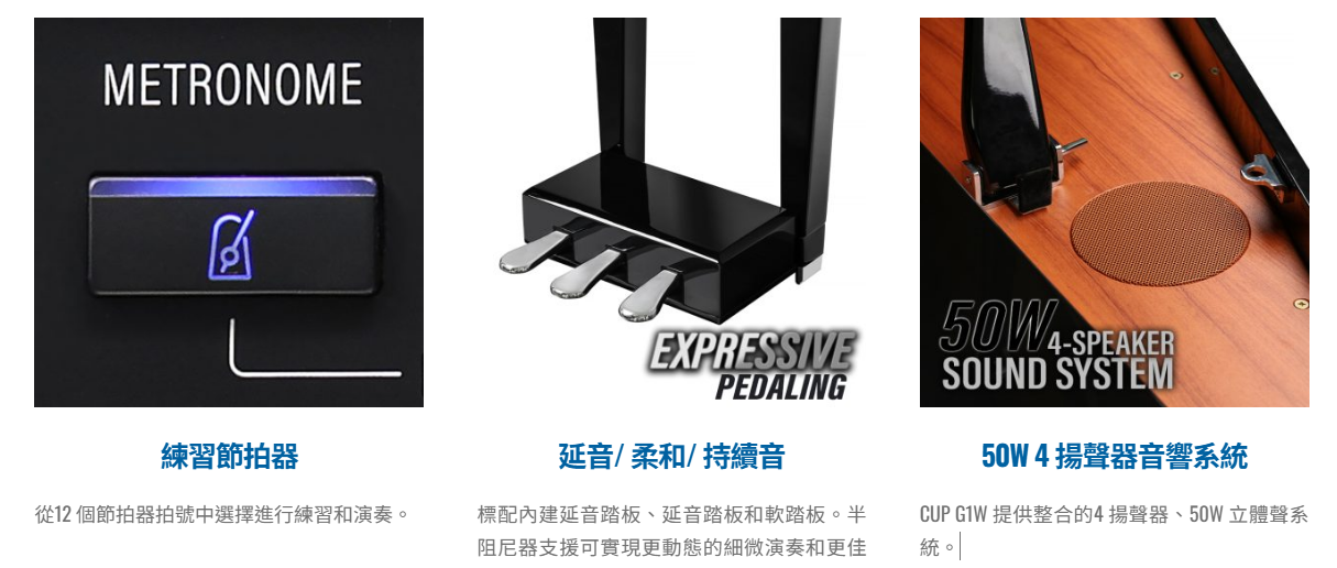 CUP G1W 利用 Kurzweil 的專業級合成器技術和業界領先的樣本,提供了德國 D 音樂會大鋼琴的豐富感覺