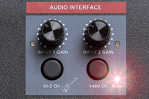 專用增益調整旋鈕、電吉他/貝斯的 Hi-Z 開關,用於麥克風的 +48V 幻象供電開關。