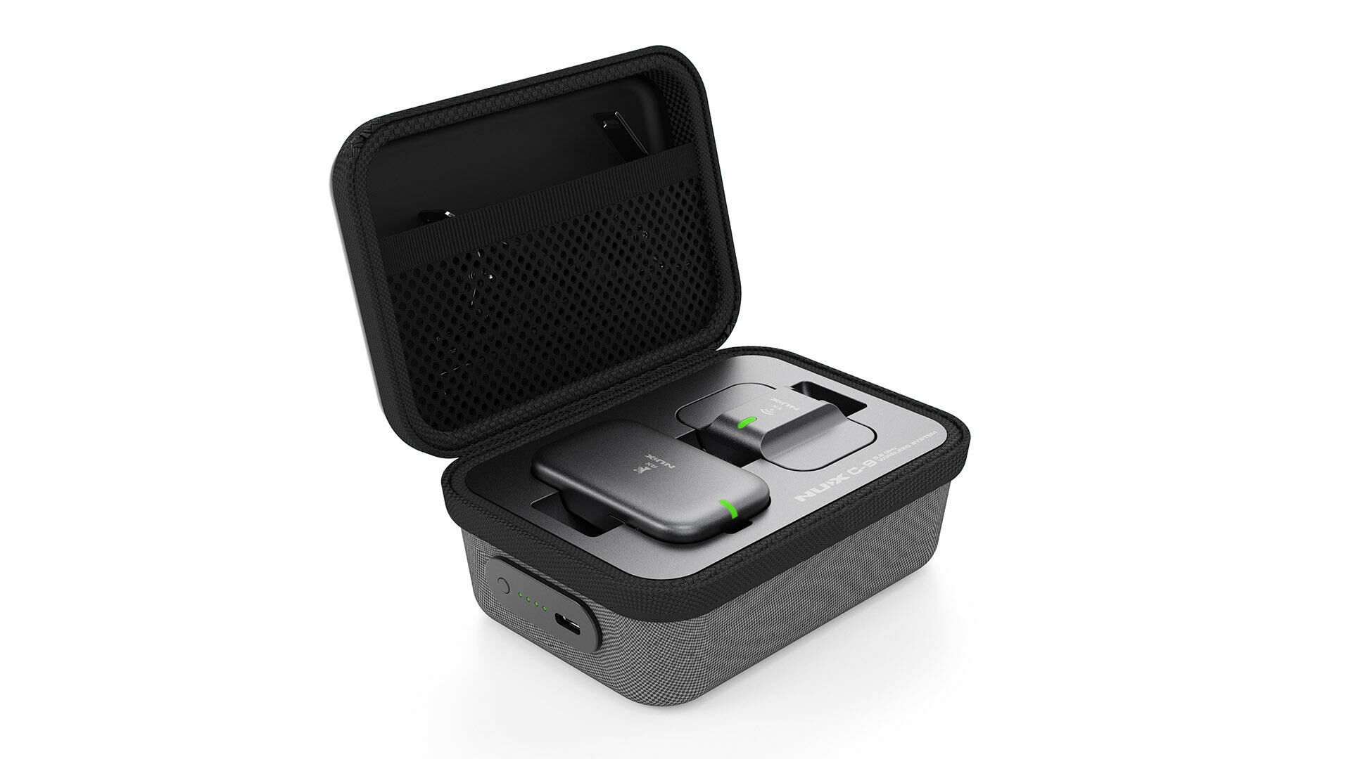 內建高性能鋰電池,可持續工作約3小時。附專用收納充電盒。將發射器和接收器放入充電盒種即可收納,輕按充電盒上的充電按鍵即開始進行充電。