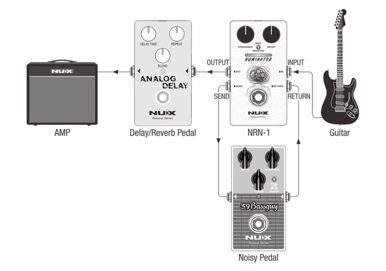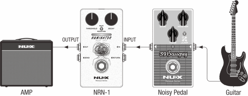 Connect the noisy pedal in the SEND/RETURN loop, the HUMINATOR will sense your guitar signal and allow the suppression circuit to activate only as your guitar signal dies out, making the sound more natural.