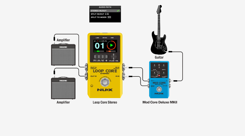 這是吉他手最常見的使用方式,吉他單聲道輸入到LOOP CORE STEREO,經過效果器後單聲道輸出到吉他音箱。 如果您要按照此路徑使用,那麼請按照以下方式設定和