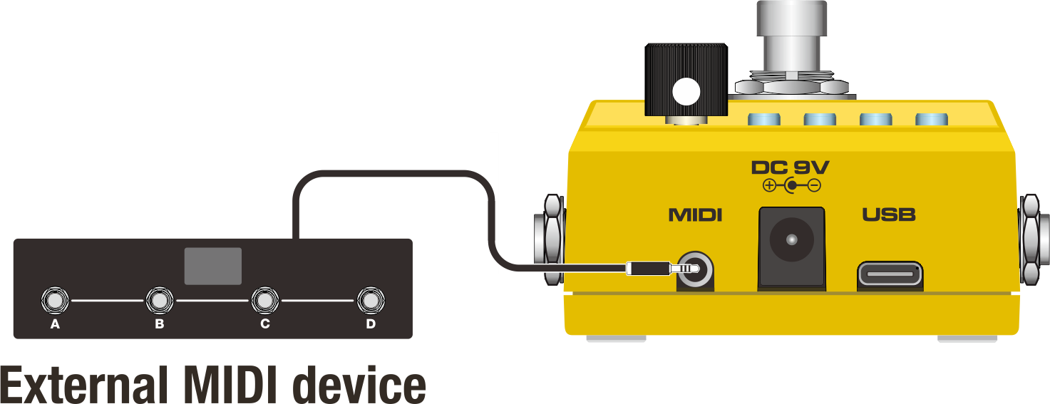 您可以使用外部MIDI踏板連接LOOP CORE STEREO的MIDI介面來控制效果器。