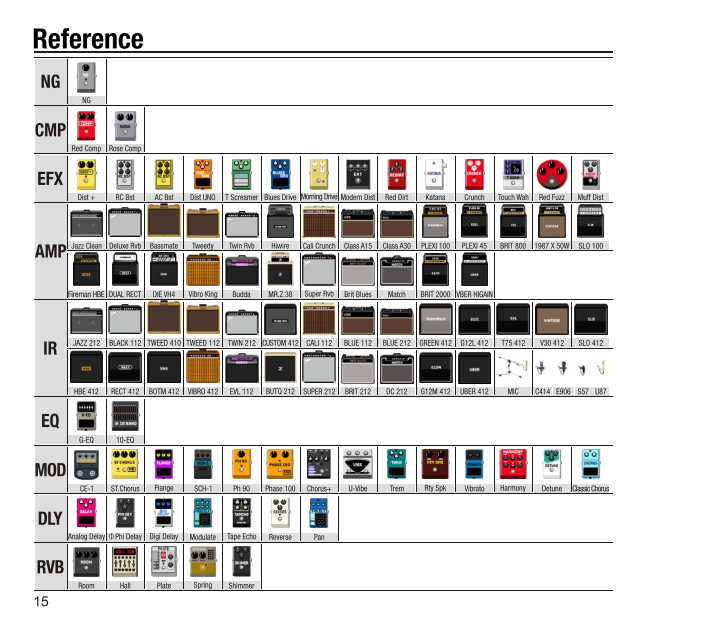 一次過可以開十種不同effect 模塊:NG、CMP、EFX、AMP、IR、EQ、MOD、DLY、RVB、PL