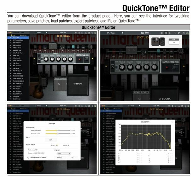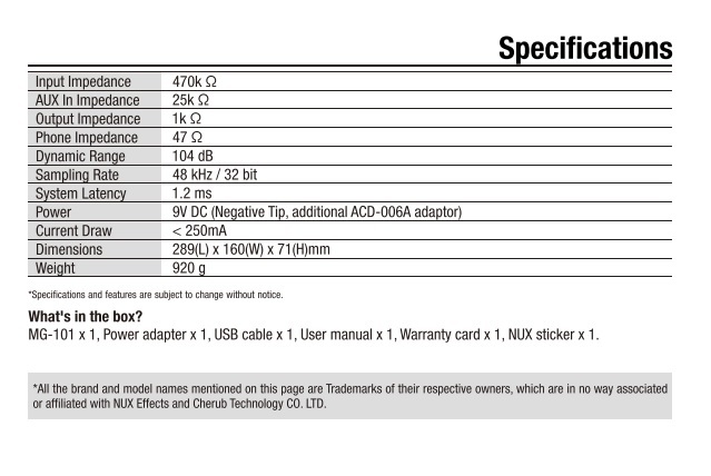 細小的MG101 內置十分強大的DSP ,32BIT高品質採樣,有數量眾多的效果,IR , 第三方IR,可耳機輸出練習使用,也可USB 連接電腦當INTERFACE使用,MG101.更可乾電池推動,方便用家在户外使用.