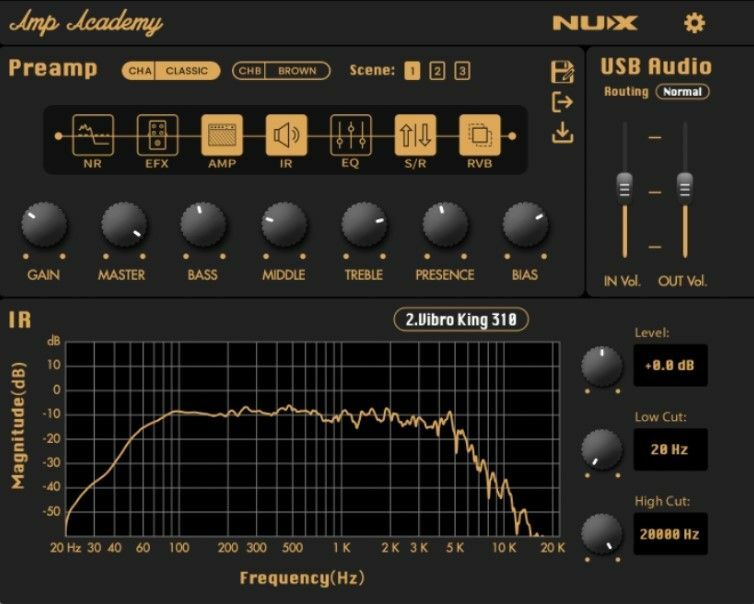 提供NR, EFX, AMP, IR, S/R, EQ, 及RVB等模塊,可自由排列順序,除了內建的10個IR檔外,還有18個空位可以讓你加載第三方IR,無須考慮採樣率,AmpAcademy編輯軟體自動轉檔(WAV格式)。