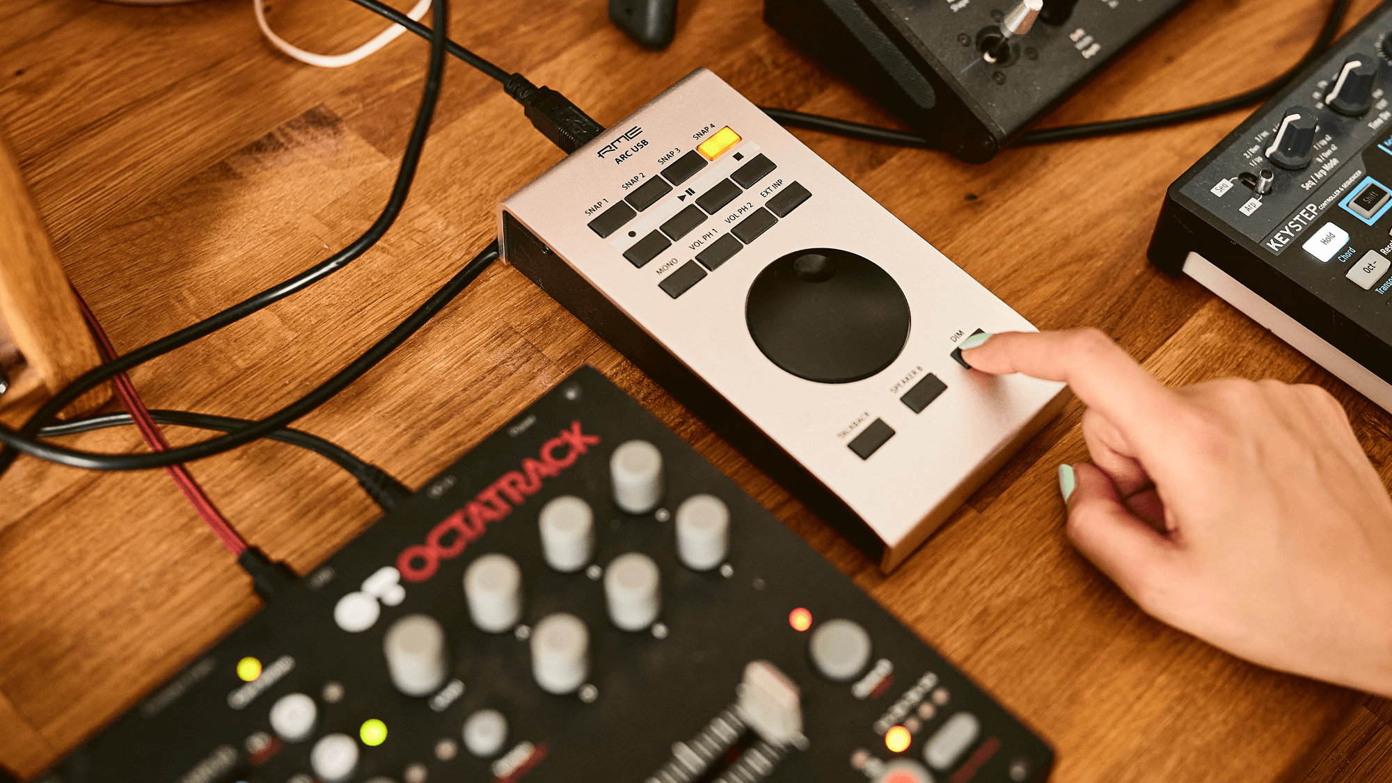 The optional available ARC USB connects to your computer via USB, and talks to TotalMix FX directly. It has 15 freely assignable and illuminated buttons, one encoder wheel, and a TS jack to connect a foot switch.