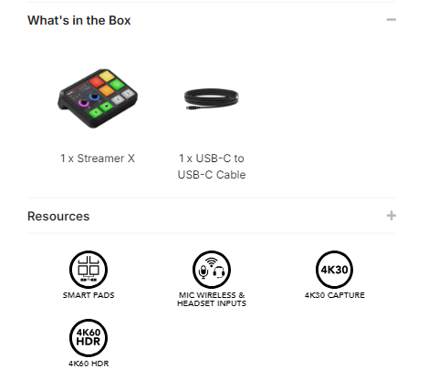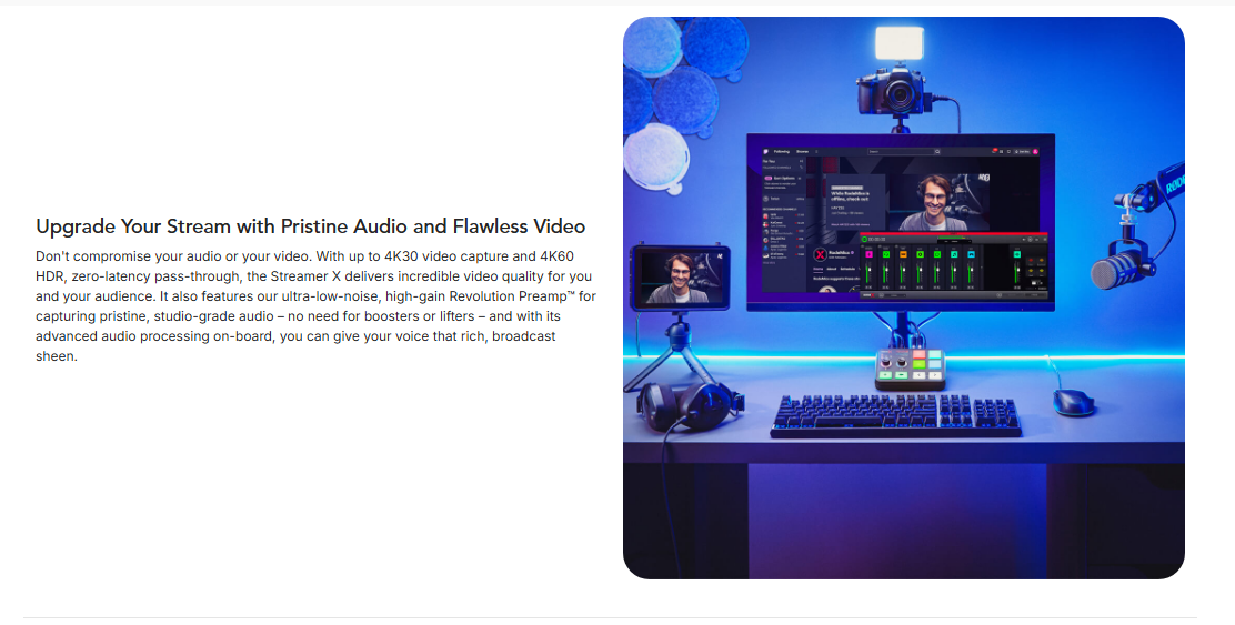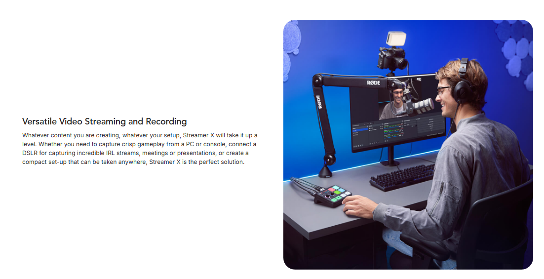 The Streamer X is a professional video capture card, audio interface and control surface integrated in one compact device that makes creating incredible content incredibly easy – the ultimate all-in-one streaming solution. It features studio-grade audio inputs for XLR microphones and instruments, headsets and RØDE wireless microphones, with an ultra-low-noise, high-gain Revolution Preamp™ and powerful APHEX® audio processing delivering pristine sound quality. HDMI connections offer up to 4K30 streaming and 4K60 pass-through for incredible video quality in a wide range of applications, from streaming and gaming, to podcasting and content creation, to business presentations. Dual USB-C connections seamlessly accommodate dual PC setups, and four fully customisable SMART pads allow for on-the-fly triggering of sound or voice FX and other actions on a computer. The ultimate all-in-one streaming solution.