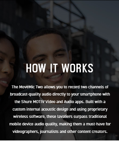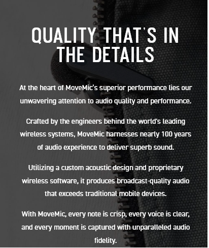 Utilizing a custom acoustic design and proprietary wireless software, MoveMic achieves broadcast-quality audio quality beyond traditional mobile devices.