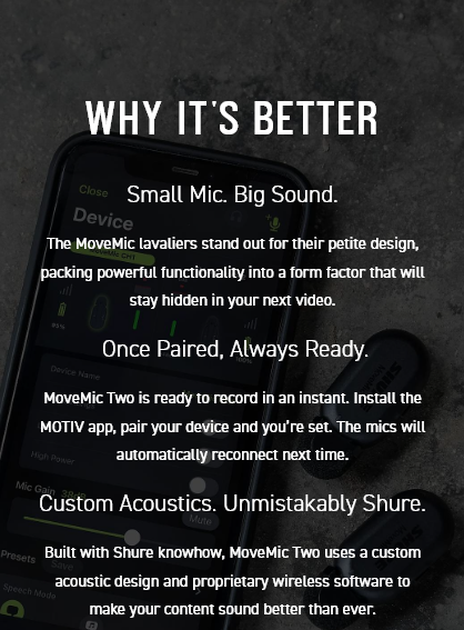 Shure engineers tapped decades of wireless knowhow to build the best audio experience possible. Using a custom acoustic design and proprietary wireless software, MoveMic takes cable-free recording to new levels of broadcast quality.