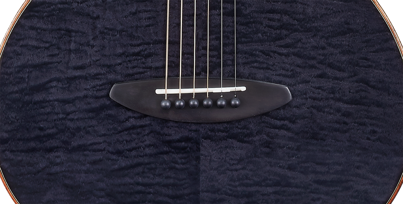 鳥吉他定製的造型琴橋,使用烏黑色澤的黑檀木,擁有緊密的木紋硬度,硬度更勝玫瑰木,能支撐琴的後段琴弦張力。搭配水牛骨弦枕,讓琴的延音有力,且擁有純淨的音色,質地堅硬清脆,能有效的傳導琴弦的共鳴。每一根弦都做了個別補償,讓琴能有更精準的音準。