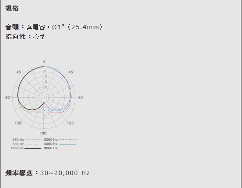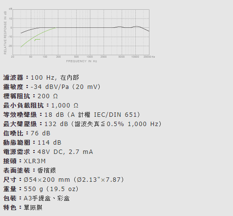 全功能錄音室等級,1"直徑鍍金3μm膜片音頭,純熟的手藝造就生動的聲音。多樣的隨附選購配件提供不同的應用與設定。 固定的心型指向特性,無任何外部的控制功能。但有個內部的高通濾波器以消除不必要的低頻噪音。