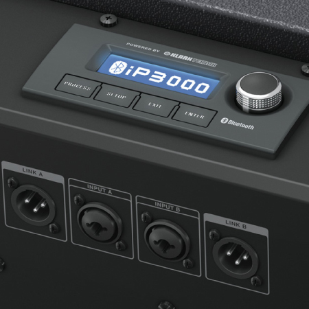 The iP3000 features a fully addressable onboard digital mixer with two combo jack/XLR connectors that accept balanced and unbalanced connections for dynamic mics and line-level instruments. The simple and intuitive user interface consists of a single rotary push-encoder with Process, Setup, Exit and Enter function buttons. A beautifully-backlit LCD display controls DSP functions including mixer parameters with input EQ and Reverb, 3 band output EQ, and presets. All settings can be controlled locally, or via free downloadable iPhone/iPad apps – and locked down to prevent unauthorised access.