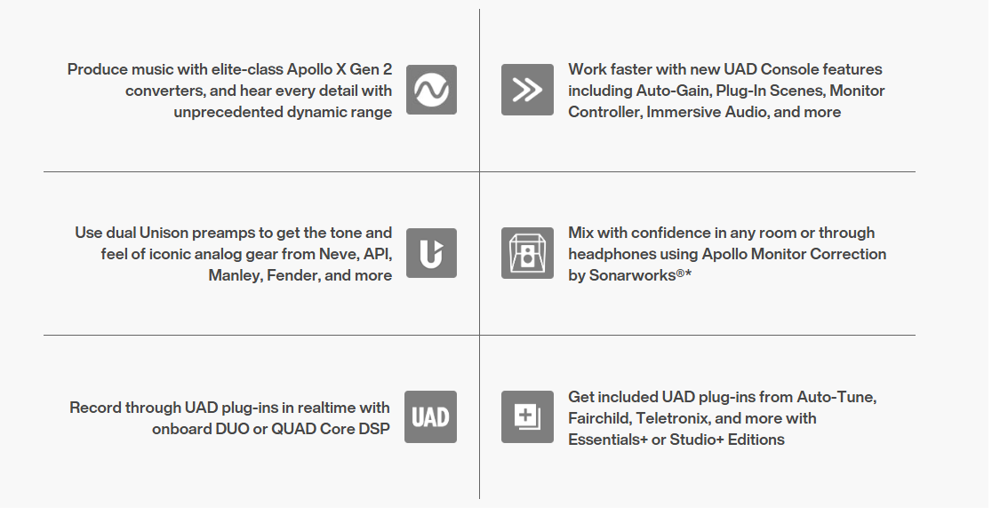 We built Apollo Twin X for the next generation of music producers looking to get the sounds used by the world’s biggest artists. With elite-class 24-bit/192 kHz Gen 2 audio conversion and the widest dynamic range to date, Apollo Twin X puts the sound of the stars in your studio.