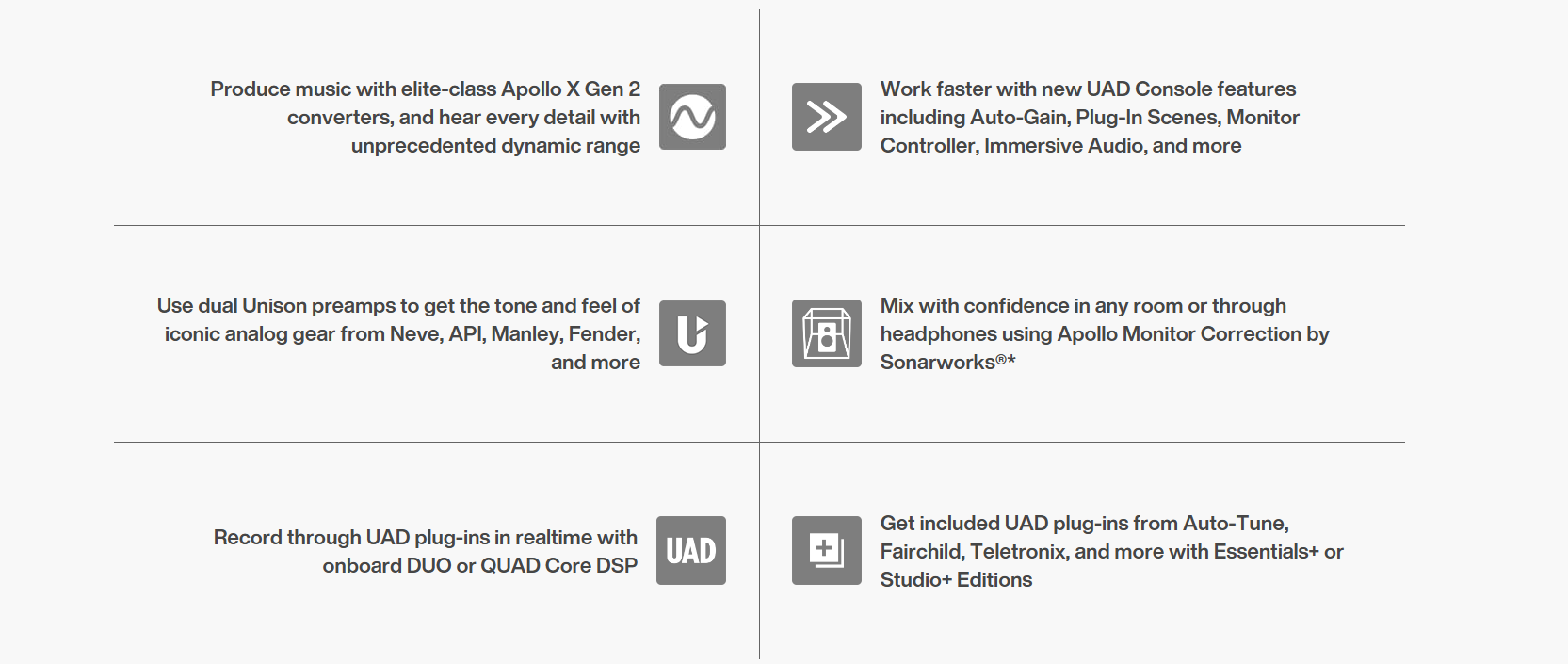 Includes up to 50+ UAD plug-ins with Essentials+ or Studio+ Editions