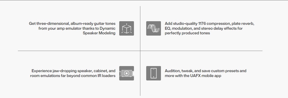 Beyond mic and speaker cabinet modeling, OX Stomp also lets you craft stunning guitar sounds with UA effects like genuine 1176 compression, plate reverb, chorus, flange, three delay types, and four-band EQ with high and low-cut filters.