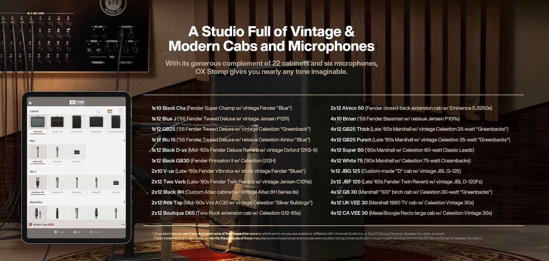 In addition to expertly placed close condenser, dynamic, and ribbon mics on your cabs, OX Stomp is the only effects pedal to offer a complete selection of room mics with Dynamic Room Modeling. This gives you the authentic experience of pushing air while recording your cranked amp in a world-class tracking room.