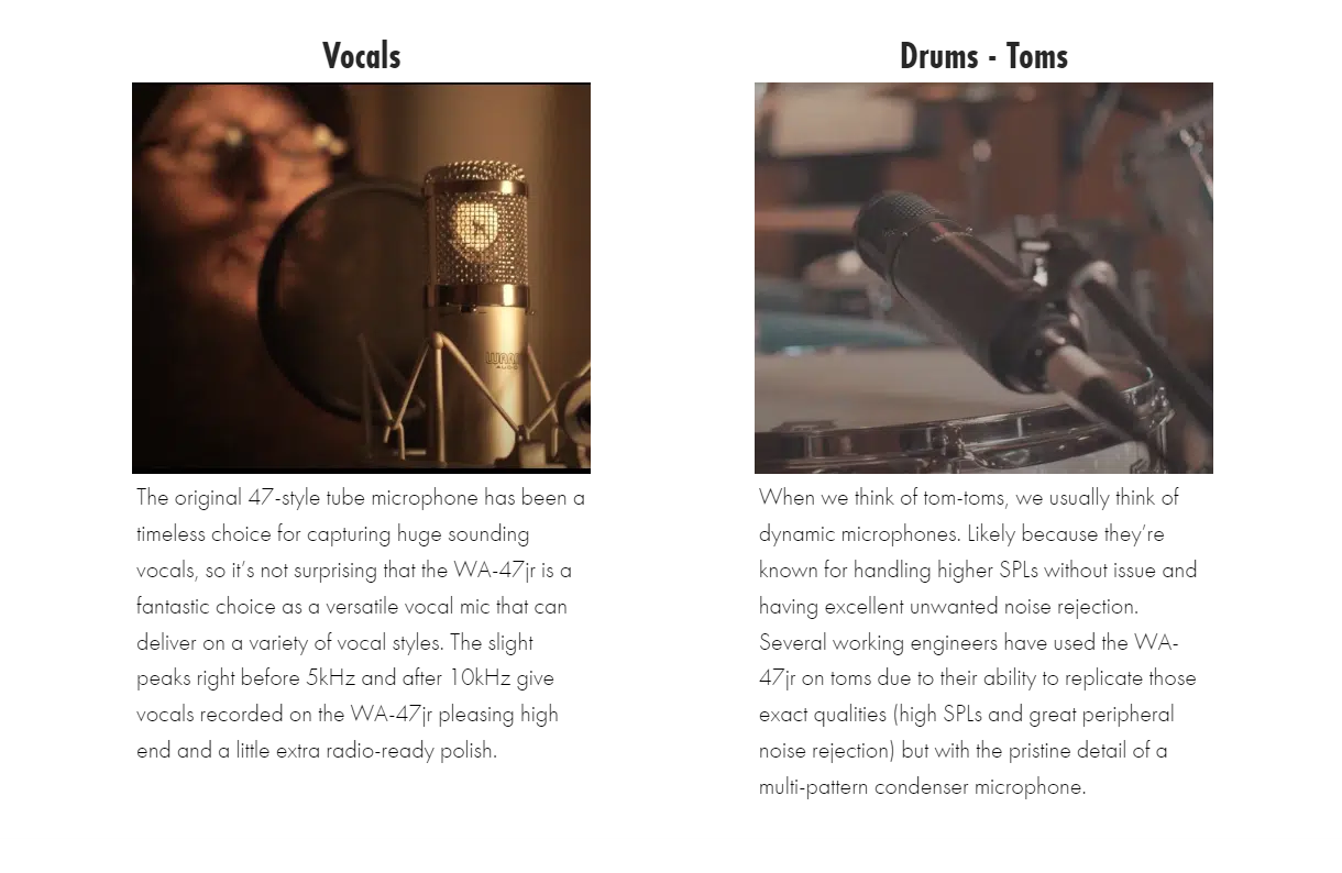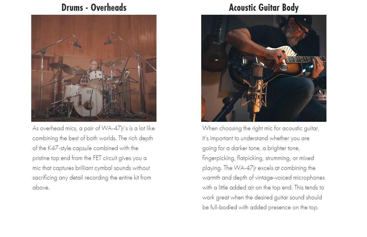 The WA-47jr is a highly adaptable and versatile professional studio microphone. Whether it's vocals, drums, guitar cabs, acoustic guitars, strings, overheads, horns, bass cabs, there's likely a part out there where the WA-47jr will excel and bring the “sound in your head” to life. Here are just a few ways that engineers and artists have used the WA-47jr to achieve fantastic results.