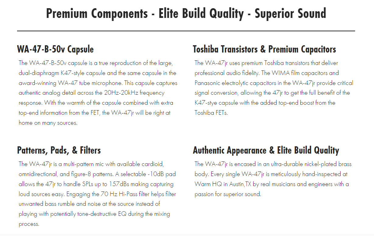 The WA-47jr is equally at home in a project studio, or in a world-class live room run by Grammy-nominated engineers. Achieving the sound profile of the WA-47jr requires honoring the past and embracing the present. The heart of the WA-47jr is the custom gold-sputtered, dual large-diaphragm, single backplate K47-style capsule. The premium Toshiba FETs in the WA-47jr allow even more top-end information compared to the original U47-style tube microphone, making the WA-47jr more pristine in the upper register. Boutique-grade polystyrene, Panasonic electrolytic, and WIMA film capacitors are used throughout the WA-47jr allowing for exceptional signal transfer throughout the microphone. Finally, the WA-47Jr wouldn't be a Warm Audio product if it wasn't a completely discrete signal path, no ICs here - just real-deal analog circuitry!